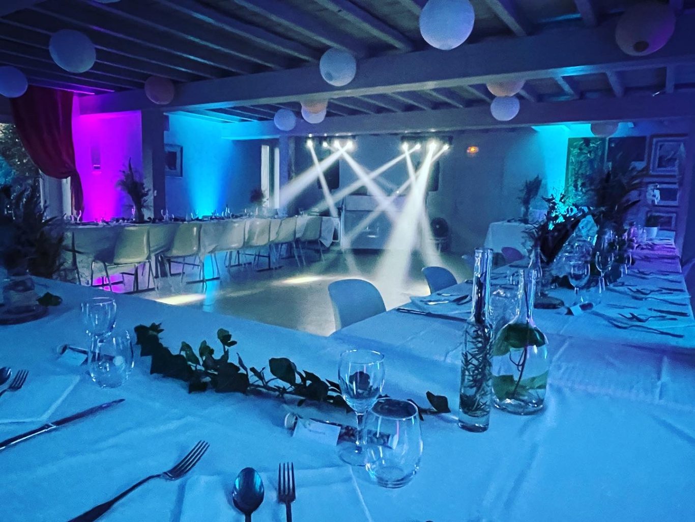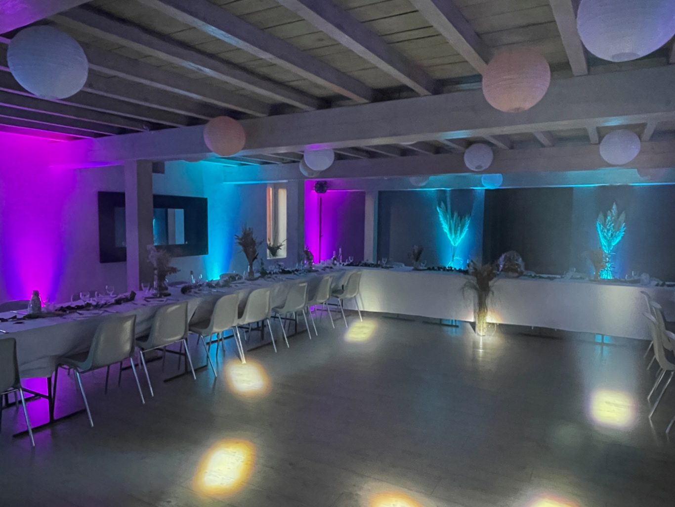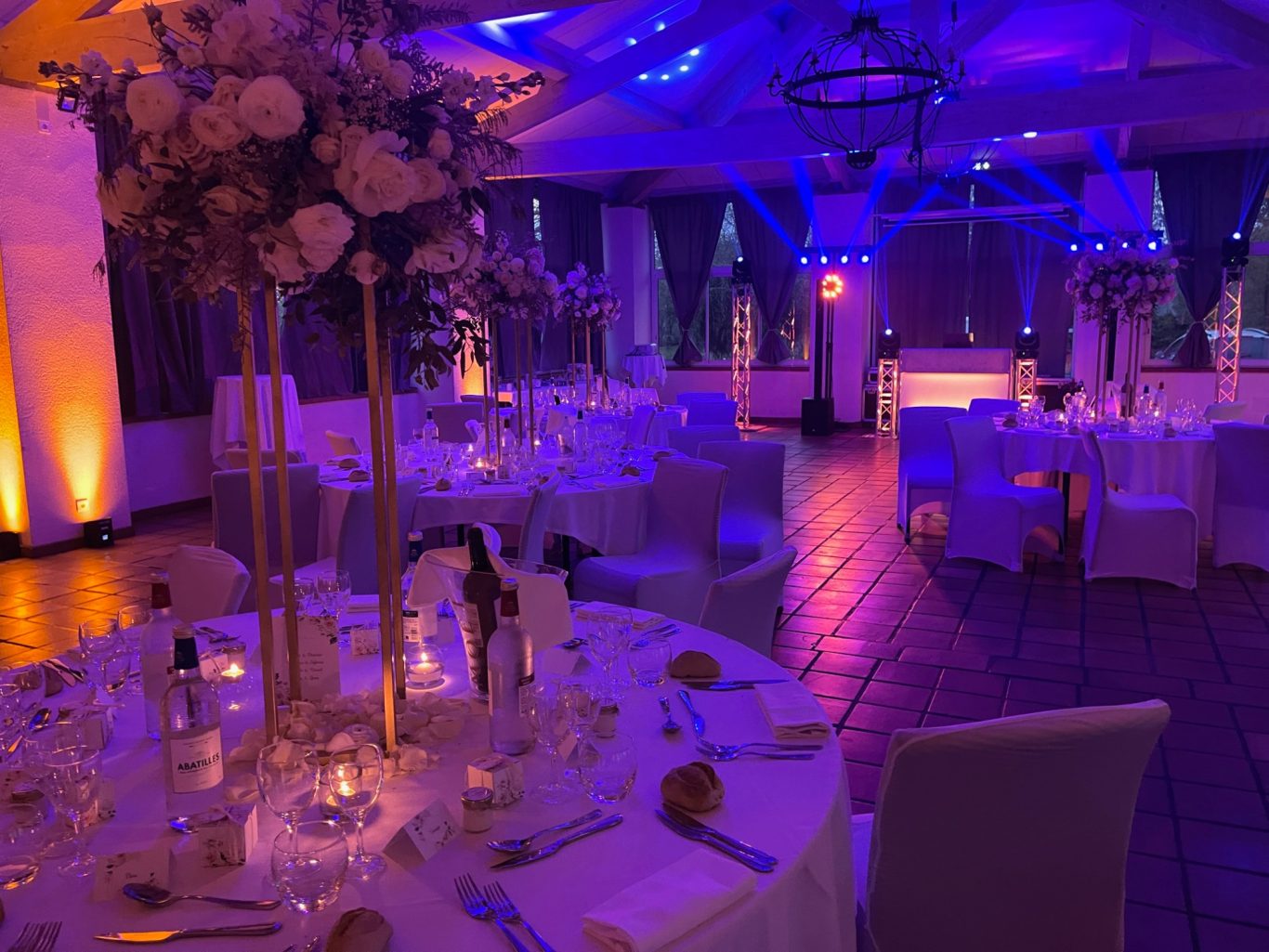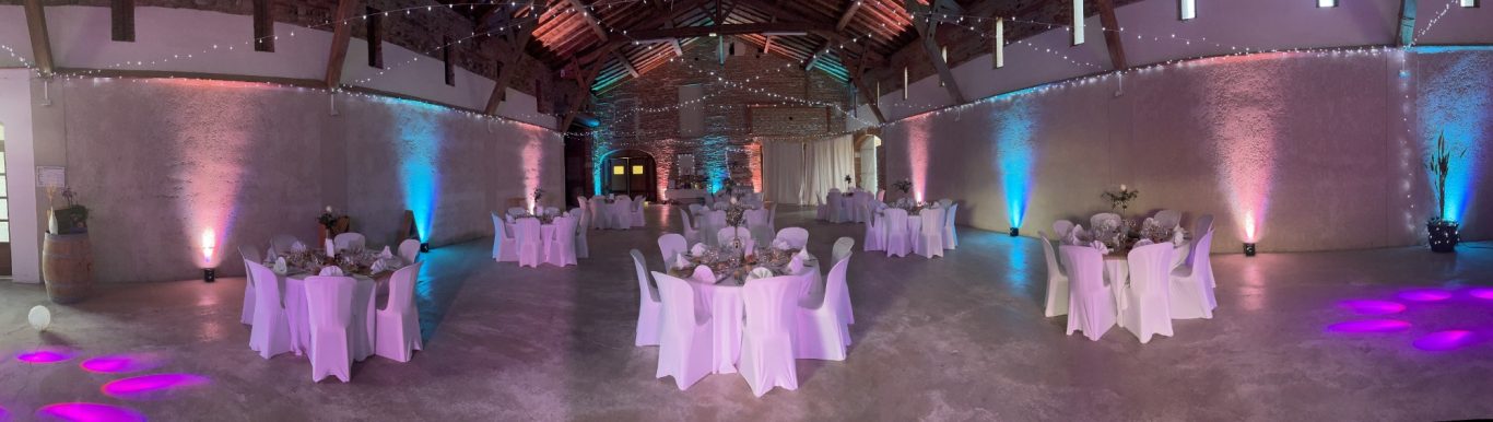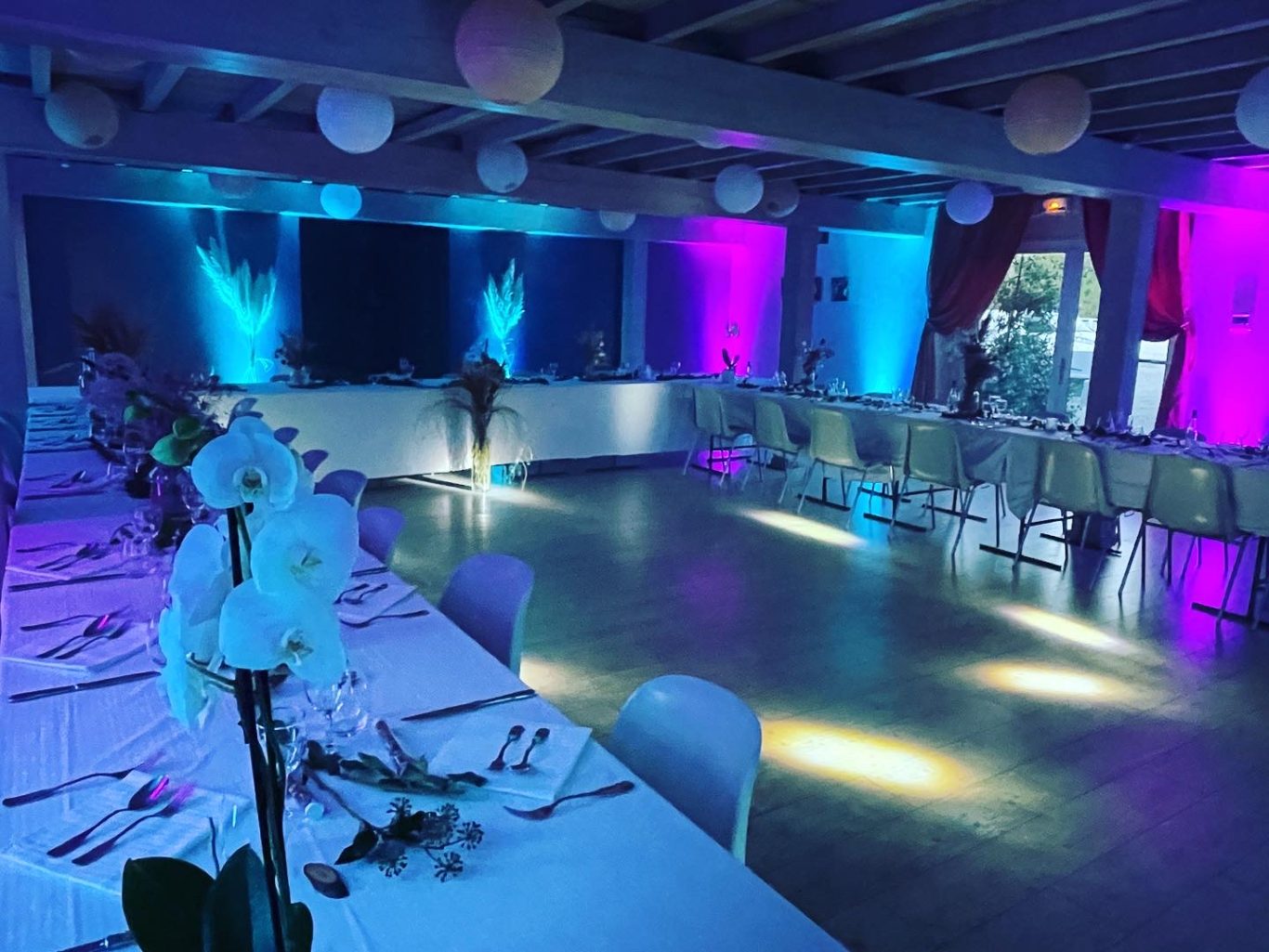 Notre installation de lumière tamisée sera répartie dans toute la salle afin de mettre en valeur et faire ressortir vos plus belles décorations et l'architecture de votre lieu de réception.