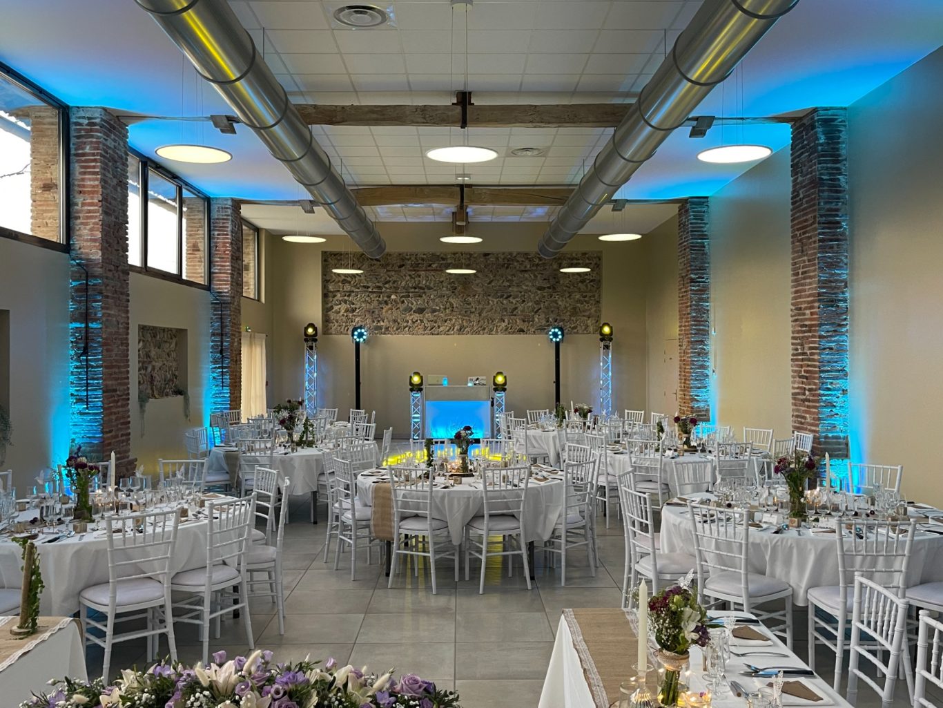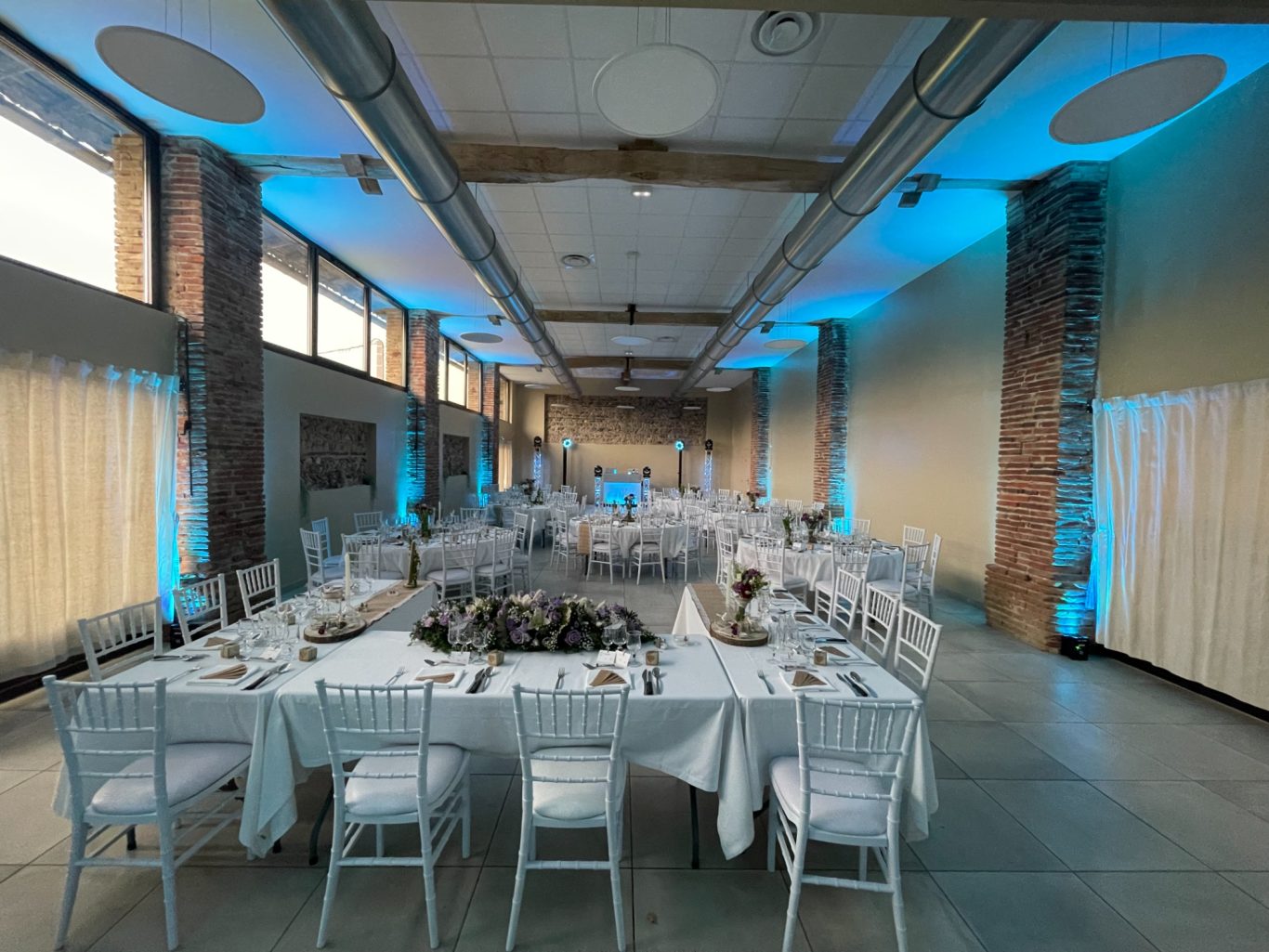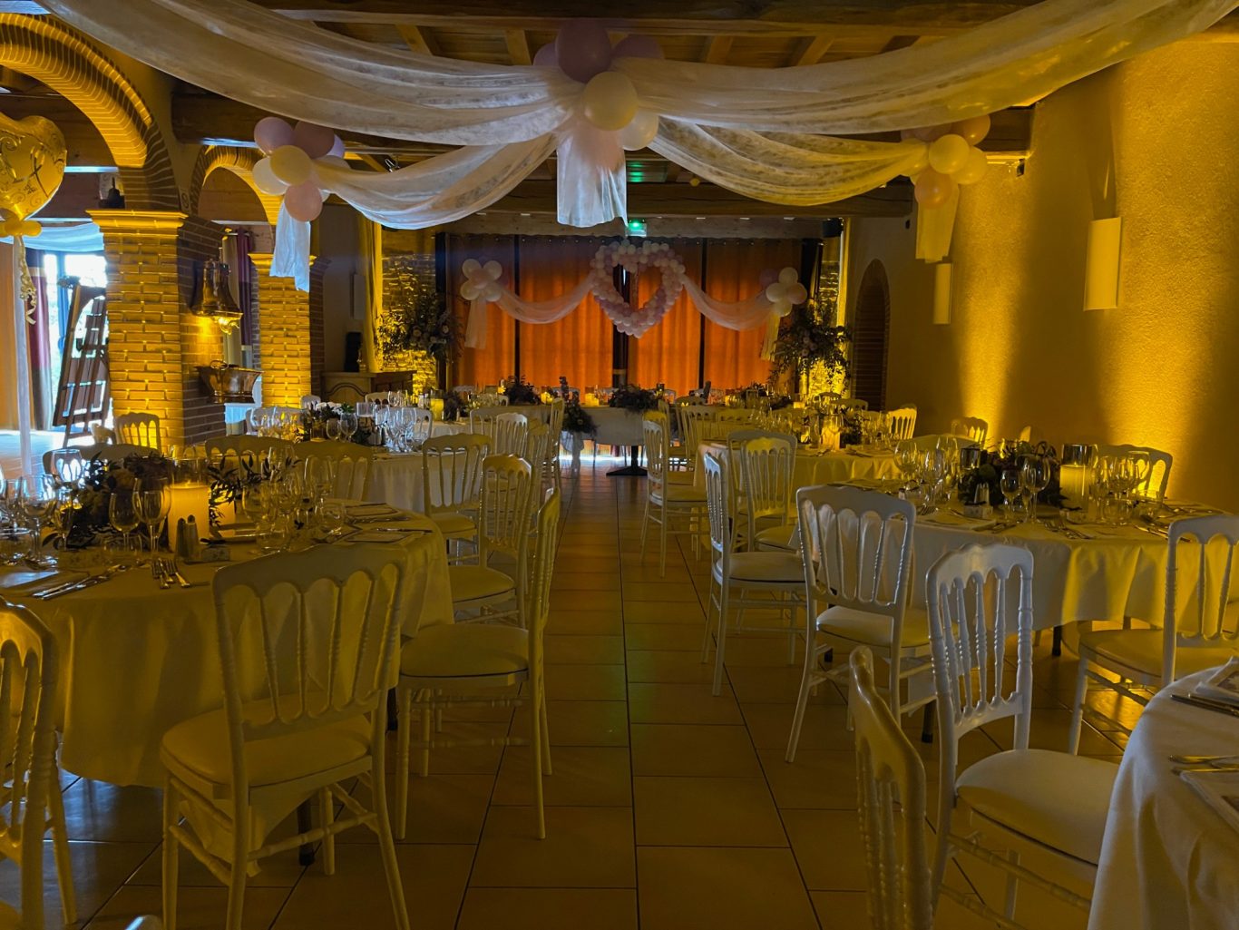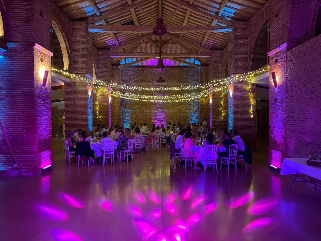 Notre installation de lumière tamisée sera répartie dans toute la salle afin de mettre en valeur et faire ressortir vos plus belles décorations et l'architecture de votre lieu de réception.
