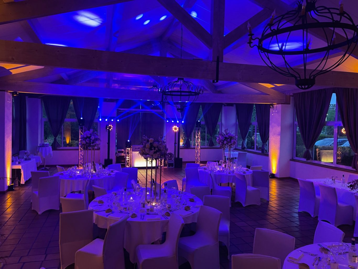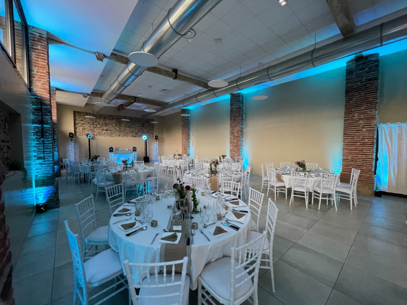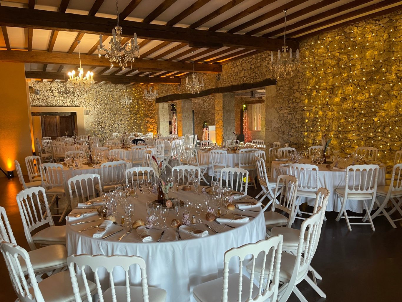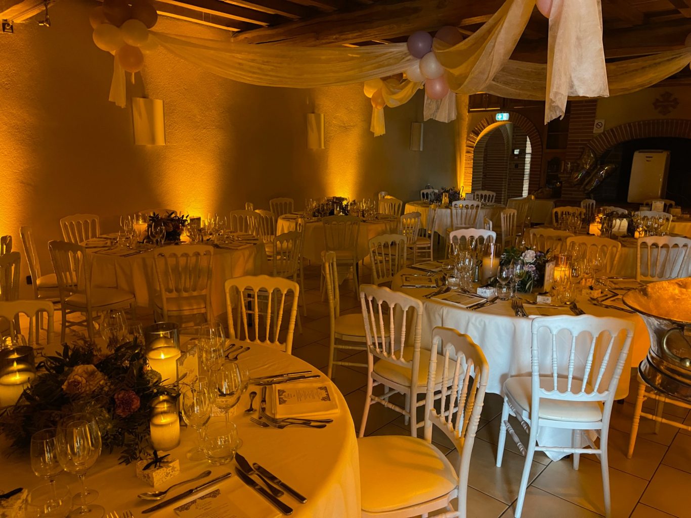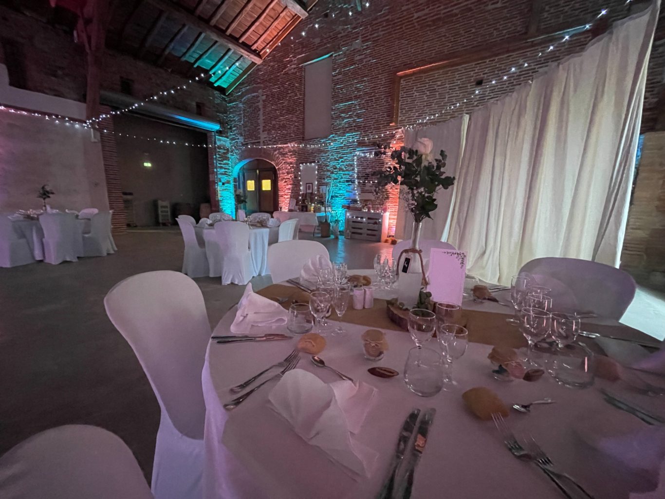 Notre installation de lumière tamisée sera répartie dans toute la salle afin de mettre en valeur et faire ressortir vos plus belles décorations et l'architecture de votre lieu de réception.